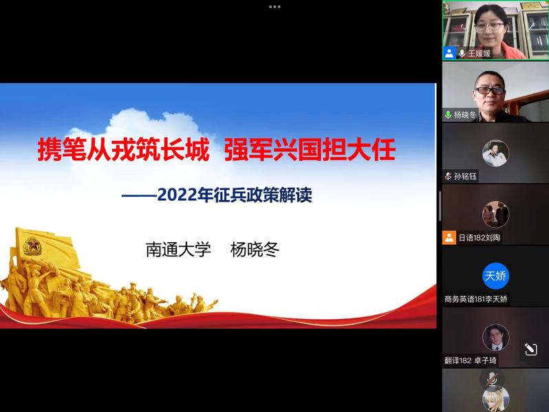 外国语学院全体辅导员、2022届毕业生以及各年级有参军入伍意向的同学参加会议。