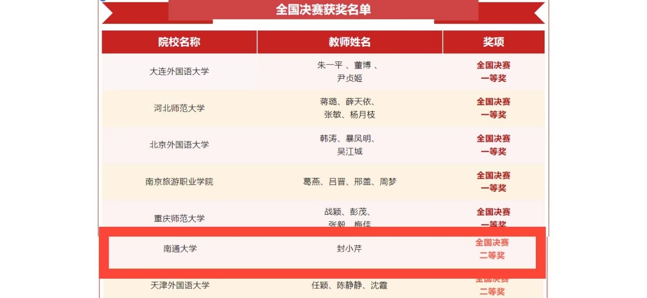 7月25日,2023“外研社杯” 全国高校日语课程思政教学设计大赛(日语专业组)评审结果公布,外国语学院教师封小芹的参赛作品获得全国决赛二等奖。