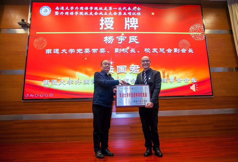 11月28日下午,外国语学院校友第一次代表大会暨外国语学院校友会成立大会召开。校党委常委、副校长、南通大学校友总会副会长杨宇民为外国语学院校友会授牌,并为外国语学院第一届领导机构成员颁发聘书。校党委常委、组织部部长王卫东出席大会。