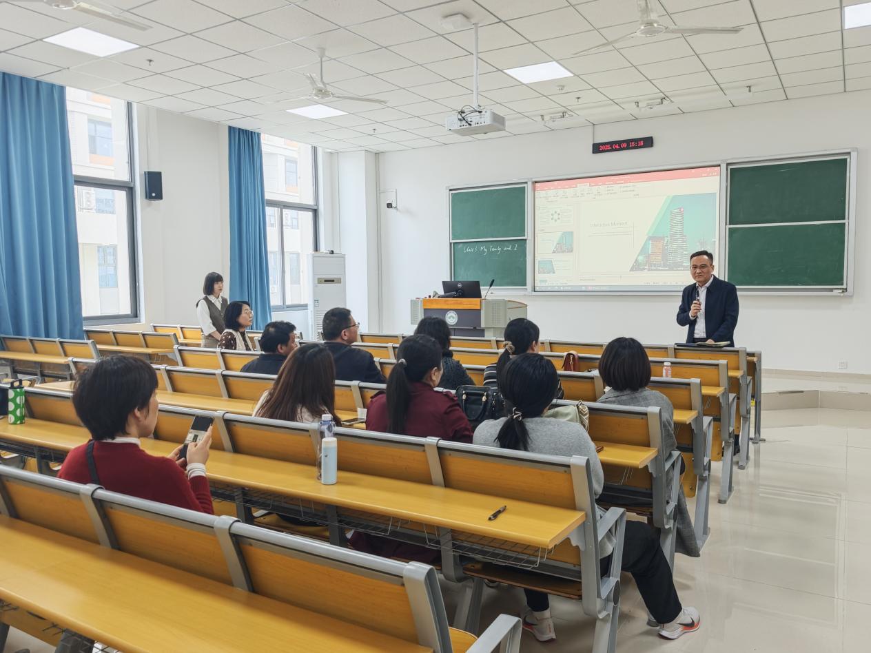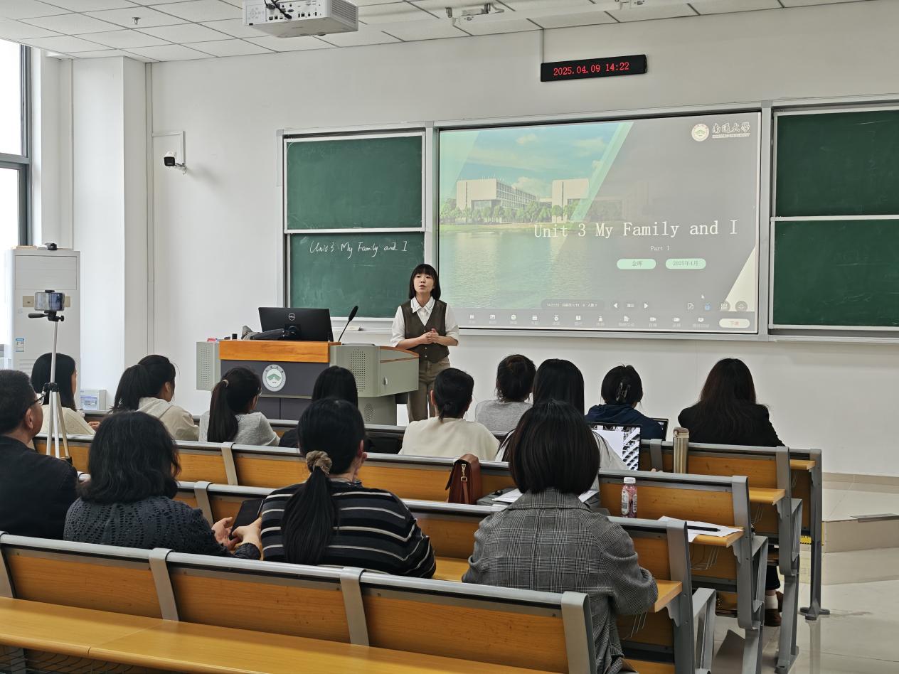 2025年4月9日下午,外国语学院英语系举办教研磨课活动,助力青年教师金晖备战“外教社杯”全国英语教学比赛。学院院长佘军、副院长王雪玉、英语系主任陈凤华、副主任姚颖,以及来自英语系、翻译系和商务英语系的四十余位教师参加了此次活动。