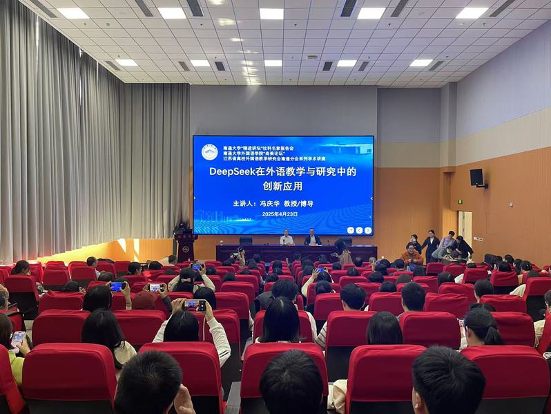 4月23日下午,原上海外国语大学党委副书记、副校长、博士生导师冯庆华教授应邀做客我校人文社科“精进讲坛”社科名家报告会、外国语学院“尚美论坛”,以及江苏省高校外国语教学研究会南通分会系列学术讲座,为我校师生以及在通高校英语教师做题为“DeepSeek在外语教学与研究中的创新应用”的学术讲座。