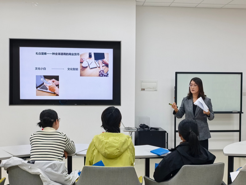 作为学校服务社会的重要窗口,外国语学院积极整合优质师资,委派长期从事跨文化交流研究与外事服务工作、兼任南通市翻译协会副会长的姜海红副教授担任分享会主讲。在分享会上,她围绕跨文化沟通的战略认知、文化差异理论、区域商务礼仪实践等模块展开系统讲解,将高校研究成果与企业实际需求有机结合,助力学员提升在国际商务环境中的专业素养与实战能力。