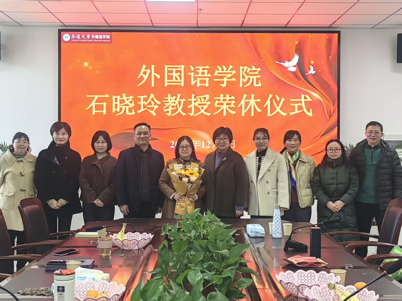 12月5日,外国语学院为商务英语系石晓玲教授举办了一场温馨而隆重的荣休仪式。外国语学院党政领导、学院工会主席、办公室主任、商务英语教研室教师代表共同参加。仪式由商务英语系主任刘道影主持。