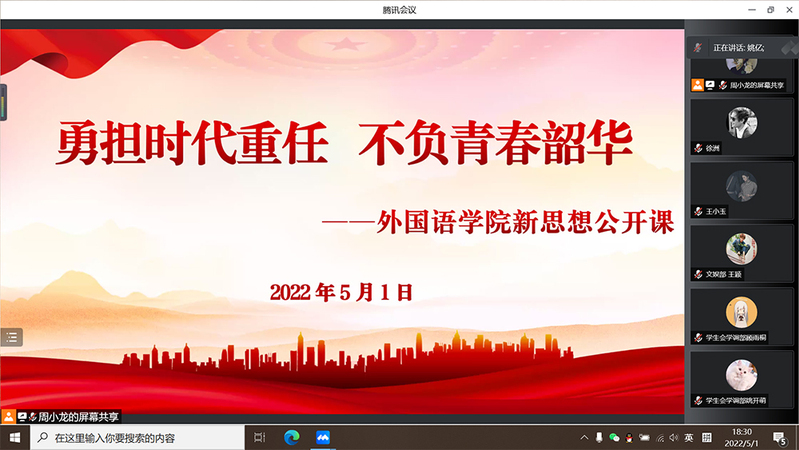 5月1日,外国语学院以线上方式举办主题为“勇担时代重任 不负青春韶华”的新思想公开课。