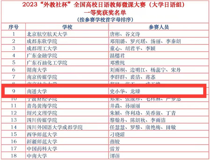 7月14日,2023“外教社杯”全国高校日语教师微课大赛评审结果公布,外国语学院教师史小华团队的参赛作品获全国一等奖。