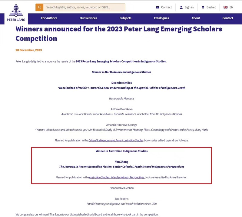 近日,兰培德国际学术出版集团(Peter Lang)“2023年度青年学者大赛”(2023 Peter Lang Emerging Scholars Competition)结果揭晓,我校外国语学院张艳博士的博士学位论文“当代澳大利亚小说中的旅行:定居殖民、女性主义和原住民的视角”(“The Journey in Recent Australian Fiction: Settler Colonial, Feminist and Indigenous Perspectives”)成功入选年度出版项目,将作为《澳大利亚研究:跨学科的视角》学术专著系列之一由兰培德出版集团出版。这是外国语学院青年教师首次获得国外知名学术出版社出版项目资助。