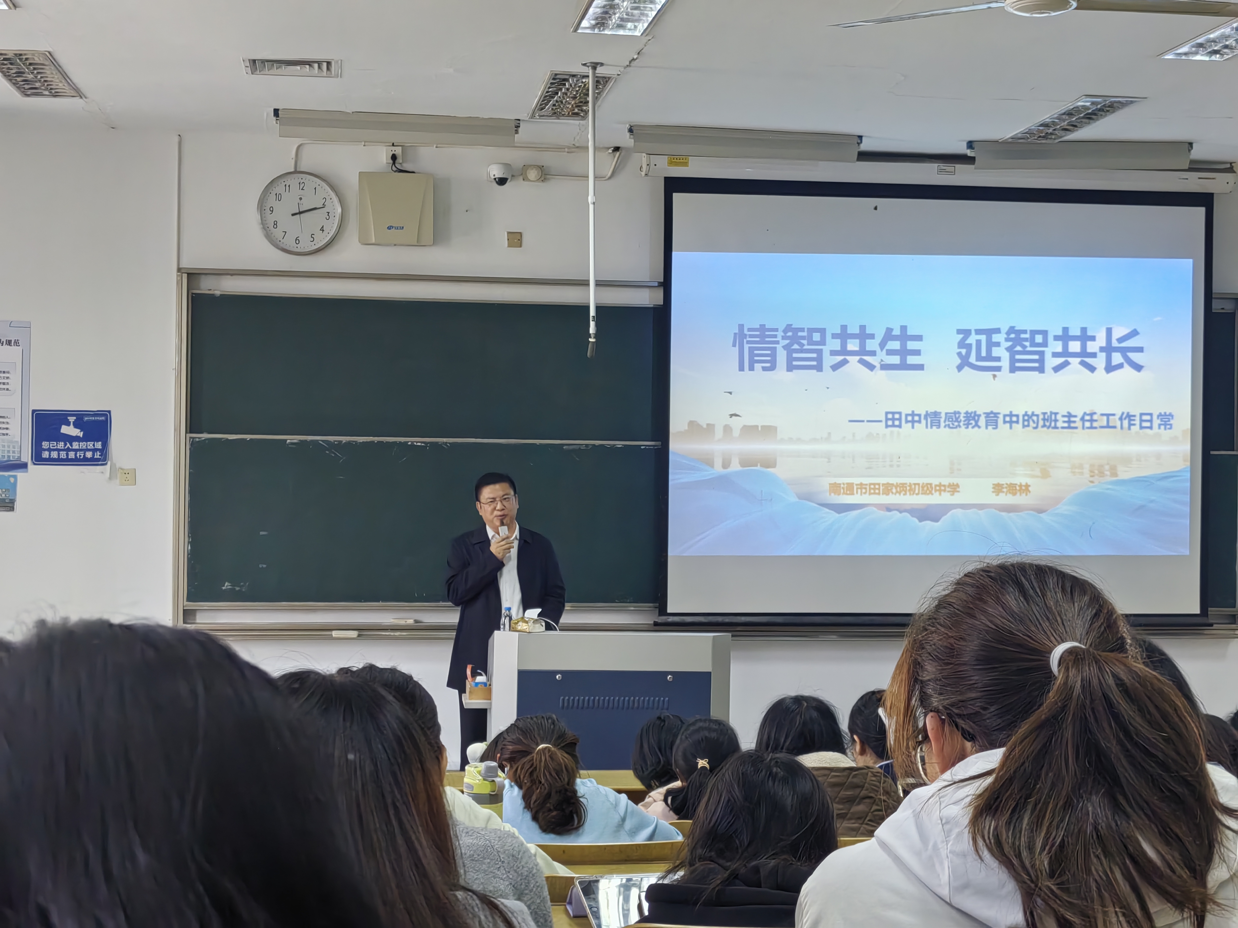 11月5日下午,外国语学院面向英语(师范)专业学生举办以“情智共生、延智共长”为主题的中学班主任经验分享会。南通市田家炳初级中学资深班主任李海林老师应邀为我院师范生分享其三十余年的班级管理智慧,助力未来教师夯实育人理念、提升实践能力。