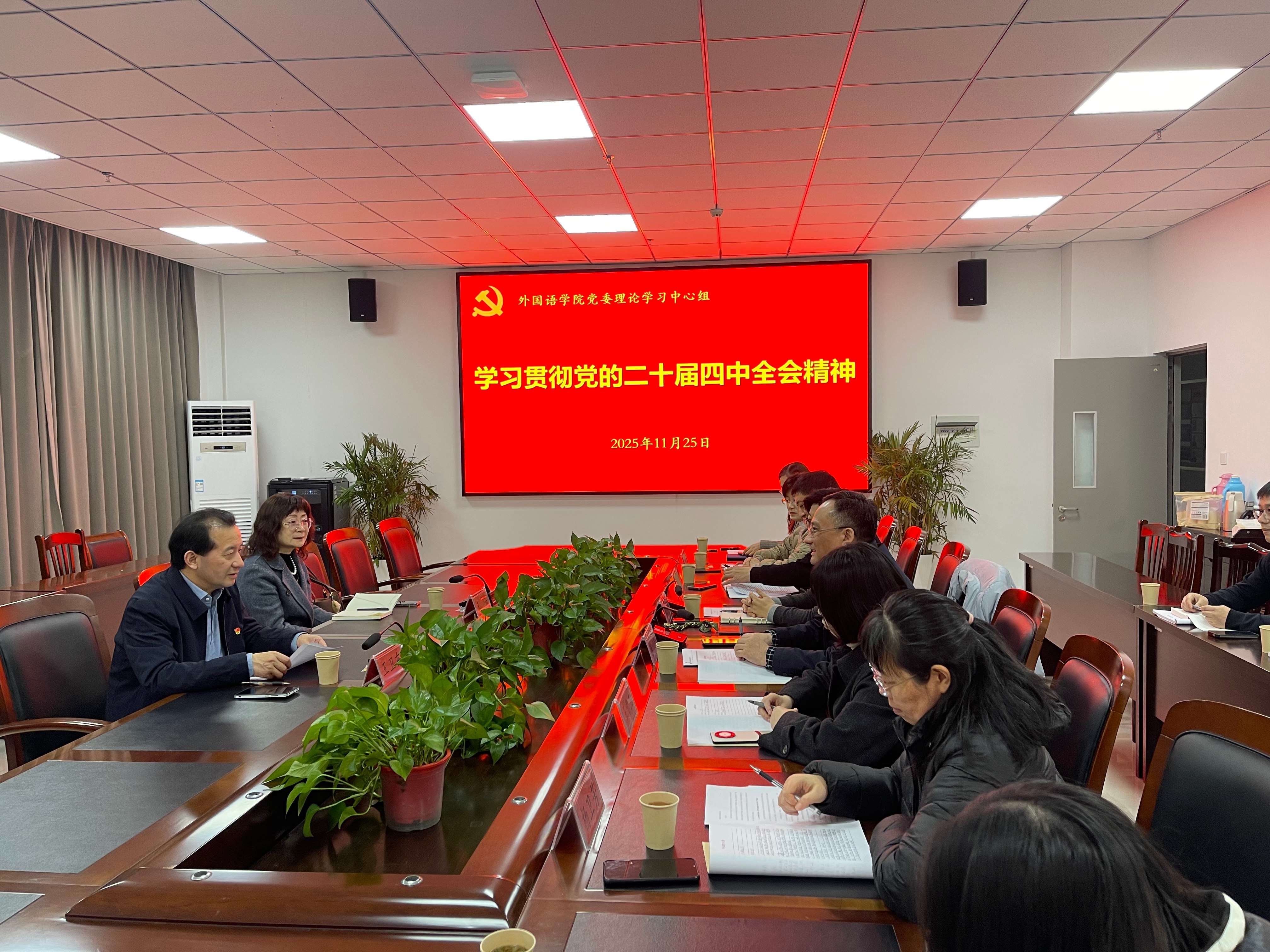 11 月 25 日下午,外国语学院召开党委理论学习中心组学习会,专题学习党的二十届四中全会精神,研究部署学院贯彻落实举措。校党委副书记王卫东、校二级党组织理论学习中心组学习督导员王芳莅临巡学旁听,学院党委书记朱小娟主持会议,中心组全体成员参会。